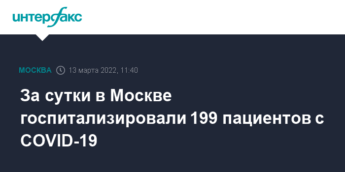 Москва. 13 марта. INTERFAX.RU - В Москве за последние сутки госпитализировали 199 пациентов с COVID-19, следует из данных портала "Стопкоронавирус.рф".