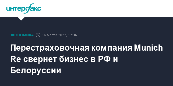 Москва. 16 марта. INTERFAX.RU - Германская Munich Re, одна из крупнейших перестраховочных компаний мира, постепенно свернет бизнес в России и Белоруссии.