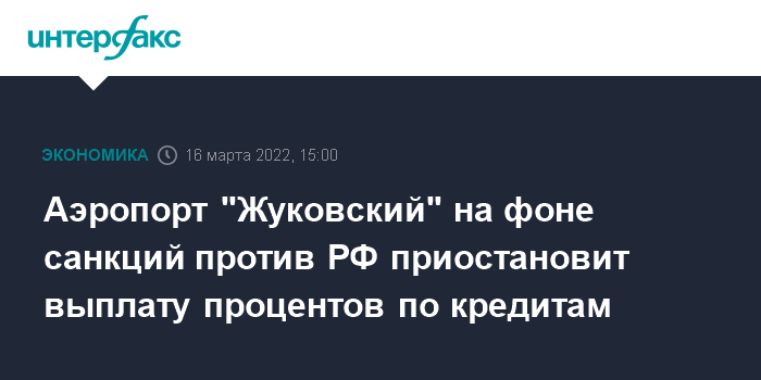 Москва. 16 марта. INTERFAX.RU - Аэропорт "Жуковский" на фоне действия антироссийских санкций договорился о приостановке выплаты процентов по кредитам, сообщили в пресс-службе АО "Рампорт аэро" (управляет аэропортом).