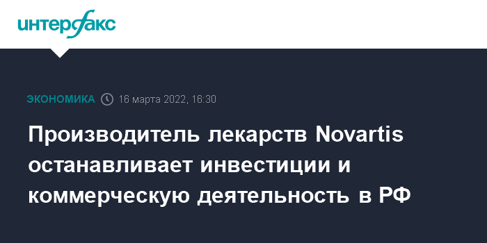 Москва. 16 марта. INTERFAX.RU - Швейцарская фармацевтическая компания Novartis AG приостанавливает инвестиции и коммерческую деятельность в России из-за военной операции на Украине.