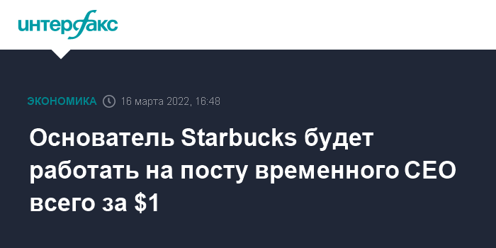 Москва. 16 марта. INTERFAX.RU - Президент и главный исполнительный директор сети кофеен Starbucks Corp. Кевин Джонсон покинет свой пост 4 апреля 2022 года, говорится в сообщении компании.