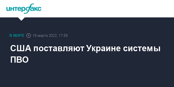 Москва. 16 марта. INTERFAX.RU - Соединенные Штаты и их союзники по НАТО направили на Украину системы противовоздушной обороны, сообщает CNN со ссылкой на неназванного высокопоставленного чиновника из США.