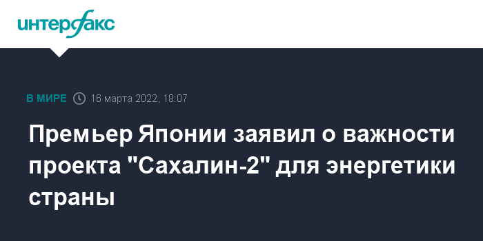 Москва. 16 марта. INTERFAX.RU - Япония на фоне введения санкций против РФ принимает меры по обеспечению стабильного поступления энергоресурсов, проект "Сахалин-2" играет здесь важную роль, заявил в среду на пресс-конференции премьер-министр Японии Фумио Кисида.