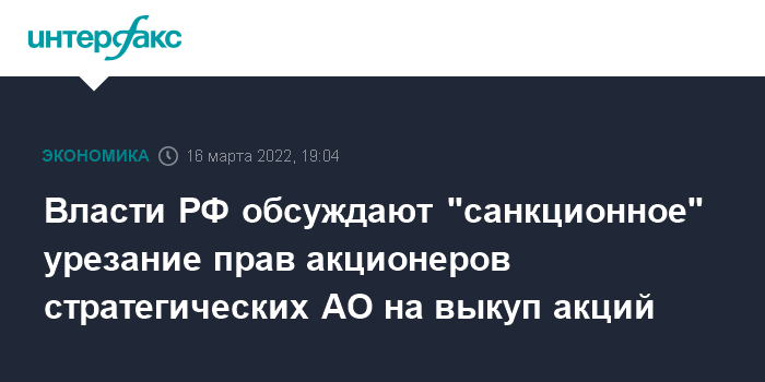 Власти РФ обсуждают "санкционное" урезание прав акционеров стратегических АО на выкуп акций