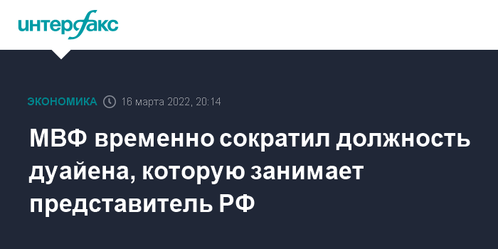 "Совет директоров принял решение временно заморозить должность дуайена совета с учетом роли России в ведущейся войне на Украине и возможного влияния на способность исполнительного директора от России эффективно выполнять свои задачи в этой должности", - отметил пресс-секретарь МВФ в письме FT.