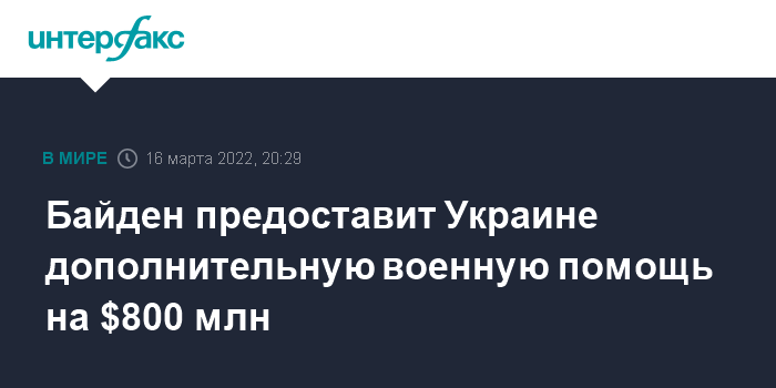 Москва. 16 марта. INTERFAX.RU - Президент США Джо Байден в среду объявил о предоставлении Украине военной помощи еще на $800 млн.