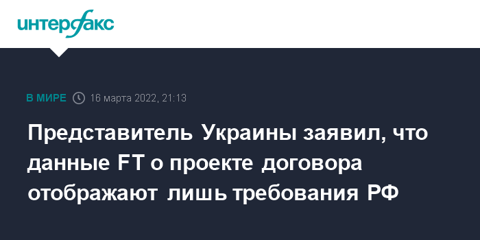 "FT опубликовал проект, в котором представлена запрашиваемая позиция российской стороны. Больше ничего. Украинская сторона имеет свои позиции. Единственное, что мы подтверждаем на данном этапе, - это прекращение огня, вывод российских войск и гарантии безопасности от ряда стран", - написал Подоляк в твиттере.