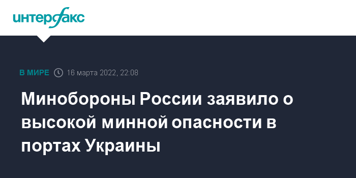 Москва. 16 марта. INTERFAX.RU - Российские военные сообщили, что экипажи 70 иностранных судов заблокированы в морских портах Украины из-за высокой минной опасности.