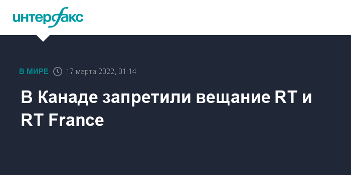 Москва. 17 марта. INTERFAX.RU - Канадский регулятор CRTC запретил вещание в стране телеканалов RT и RT France, финансируемых российским правительством, сообщает телерадиокорпорация CBC.