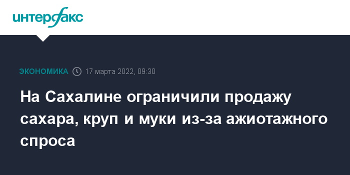 Москва. 17 марта. INTERFAX.RU - Ограничения по продаже сахара, круп, муки, растительного масла введены в магазинах Сахалинской области в связи с ажиотажным спросом на эти товары. Об этом сообщила министр сельского хозяйства и торговли региона Инна Павленко на пленарном заседании Сахалинской облдумы в четверг.