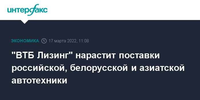 Москва. 17 марта. INTERFAX.RU - "ВТБ Лизинг" (лизинговая "дочка" ВТБ, ВТБЛ) сообщила, что планирует в рамках своего портфеля частично компенсировать приостановку поставок западной автотехники продукцией из России, Белоруссии и азиатских стран.