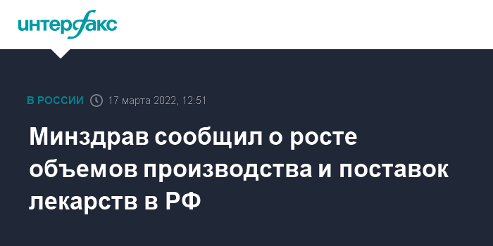 Москва. 17 марта. INTERFAX.RU - Объемы производства в России и поставок в страну лекарственных препаратов и фармацевтических субстанций, в том числе импортных, в текущем году существенно больше, чем в 2021 году, сообщил глава Минздрава РФ Михаил Мурашко.