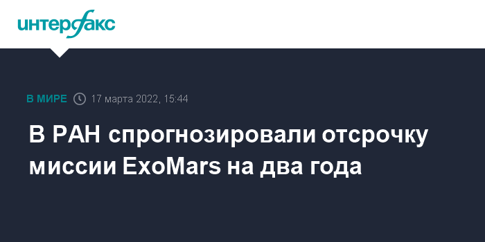 Москва. 17 марта. INTERFAX.RU - Европейское космическое агентство (ESA) вероятно перенесет российско-европейскую миссию ExoMars-2022 на два года. Об этом сообщил научный руководитель Института космических исследований (ИКИ) РАН Лев Зеленый.
