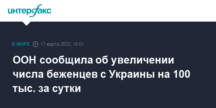 Москва. 17 марта. INTERFAX.RU - Количество украинских беженцев за последние 24 часа увеличилось на 100 тысяч человек, сообщают европейские СМИ со ссылкой на данные ООН.