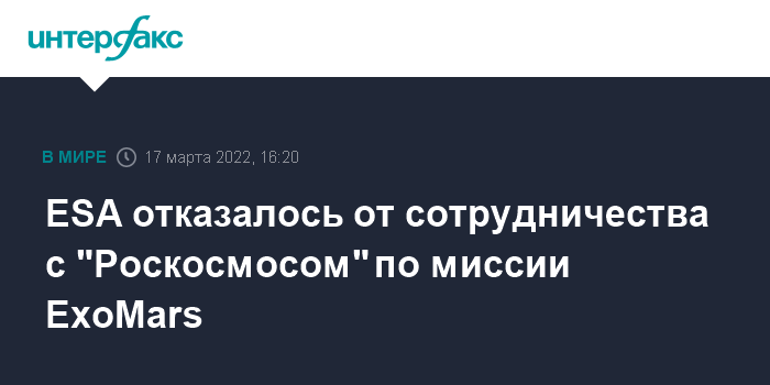28 февраля в ESA сообщили, что запуск российско-европейского аппарата ExoMars в 2022 году маловероятен из-за санкций в отношении России. 10 марта глава "Роскосмоса" Дмитрий Рогозин заявлял, что запуск российско-европейского космического аппарата ExoMars-2022 в этом году, скорее всего, не состоится из-за деструктивной позиции ESA. При этом, по словам Рогозина, ракета "Протон-М" для запуска аппарата ЕxoМars-2022 готова к отправке на космодром Байконур, "Роскосмос" ожидает решения ESA.