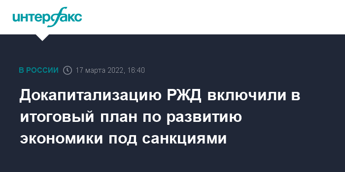 Москва. 17 марта. INTERFAX.RU - Решение о докапитализации ОАО "РЖД" вошло в итоговый план первоочередных действий по обеспечению развития российской экономики в условиях внешнего санкционного давления.