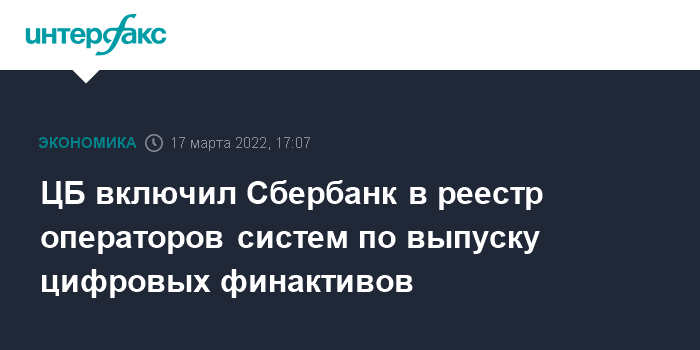 Москва. 17 марта. INTERFAX.RU - Сбербанк вошел в реестр операторов информационных систем, в которых осуществляется выпуск цифровых финансовых активов (ЦФА), сообщил ЦБ.