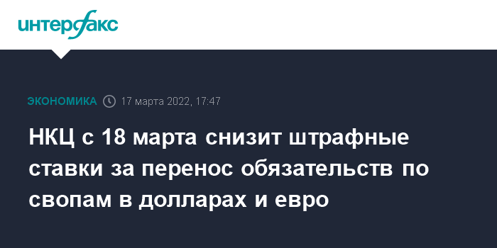 Москва. 17 марта. INTERFAX.RU - Национальный клиринговый центр (НКЦ) с 18 марта снизит размер штрафной ставки за перенос обязательств по сделкам своп по доллару США с 40% до 4% и евро - с 40% до 2%, сообщается на сайте Московской биржи.