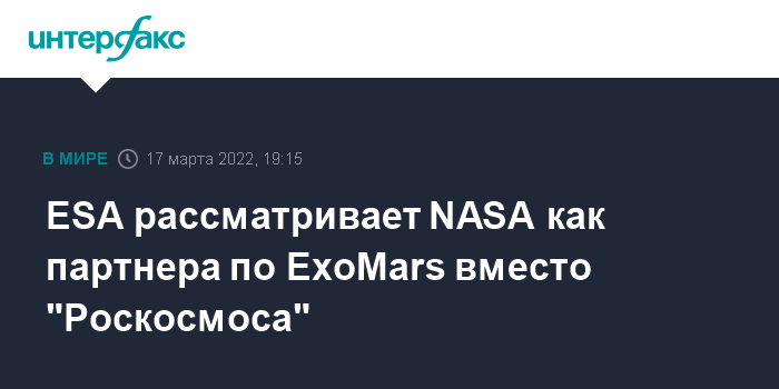 Москва. 17 марта. INTERFAX.RU - Европейское космическое агентство (ESA) рассматривает возможность сотрудничества с Национальным агентством США по аэронавтике и космическому пространству (NASA) по программе ExoMars после отказа от взаимодействия с "Роскосмосом", заявил глава ESA Йозеф Ашбахер.