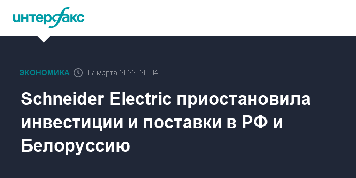 Москва. 17 марта. INTERFAX.RU - Французская Schneider Electric с 24 февраля приостановила новые инвестиции и поставки в рамках новых проектов в Россию и Белоруссию, сообщила компания.
