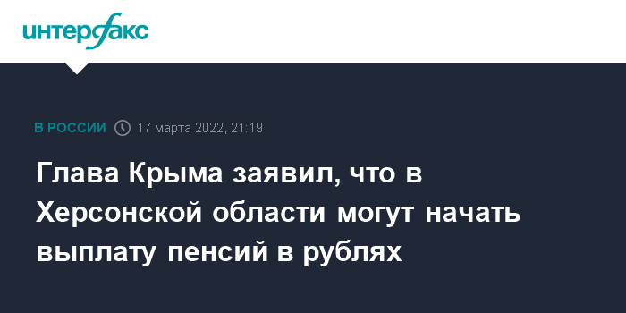 Москва. 17 марта. INTERFAX.RU - Решается вопрос о выплате жителям украинской Херсонской области, которая перешла под контроль российских военных, пенсий и зарплат в рублях, сообщил глава Крыма Сергей Аксенов.