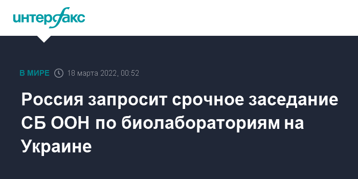 Москва. 18 марта. INTERFAX.RU - Постоянный представитель РФ при ООН Василий Небензя объявил, что Россия снимает запрос о голосовании по проекту резолюции по гуманитарной ситуации на Украине, которое было намечено на пятницу, а вместо него запрашивает экстренное заседание Совбеза по теме биолабораторий на Украине.
