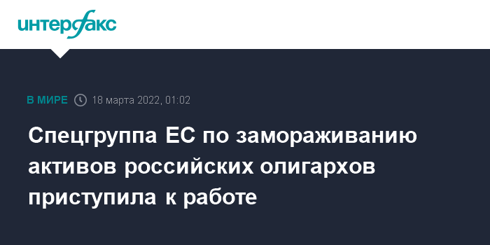 Москва. 18 марта. INTERFAX.RU - Специальная группа Европейской комиссии по замораживанию и аресту европейских активов российских и белорусских олигархов приступила к работе в координации с коллегами из "большой семерки" (G7).