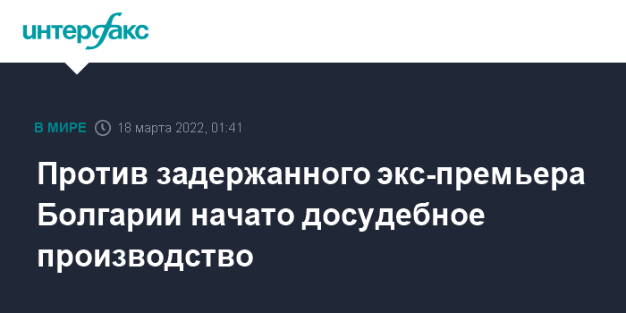 Москва. 18 марта. INTERFAX.RU - В отношении бывшего премьер-министра Болгарии Бойко Борисова, который был задержан в четверг вечером в ходе полицейской спецоперации, избрана мера пресечения в виде заключения под стражу на 24 часа, начато досудебное производство, сообщил в эфире Болгарского национального радио его адвокат Менко Менков.