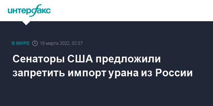 Москва. 18 марта. INTERFAX.RU - Американские сенаторы-республиканцы внесли на рассмотрение законопроект о запрете импорта российского урана.