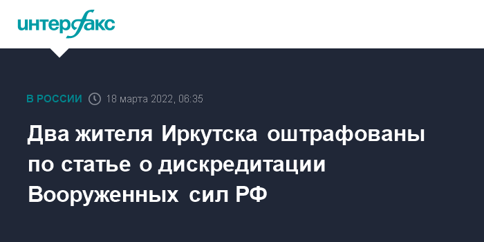 Москва. 18 марта. INTERFAX.RU - Кировский районный суд Иркутска назначил штрафы в 30 и 35 тыс. рублей соответственно двум местным жителям за дискредитацию Вооруженных сил РФ, сообщила в пятницу пресс-служба главного управления МВД по региону.