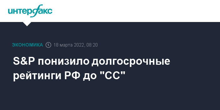 Москва. 18 марта. INTERFAX.RU - Международное рейтинговое агентство S&P Global Ratings понизило долгосрочный кредитный рейтинг Российской Федерации в национальной и иностранной валюте до "CC" с " CCC-", говорится в пресс-релизе агентства.