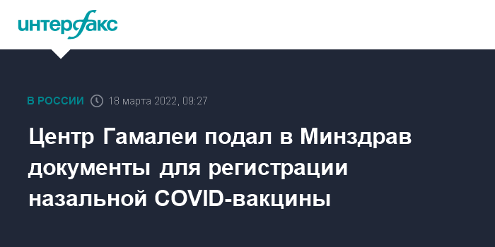 Москва. 18 марта. INTERFAX.RU - Центр имени Гамалеи Минздрава России обратился в Минздрав для получения регистрации интраназальной формы вакцины "Спутник V", соответствующая информация появилась в Государственном реестре лекарственных средств. Факт обращения подтвердил директор центра Александр Гинцбург.