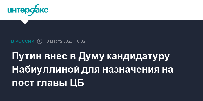 Москва. 18 марта. INTERFAX.RU - Президент Владимир Путин в соответствии с пунктом "г" статьи 83 Конституции РФ внес в Госдуму кандидатуру Эльвиры Набиуллиной для назначения на должность председателя Центрального банка России, сообщает в пятницу сайт нижней палаты парламента.