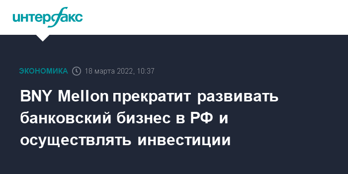 Москва. 18 марта. INTERFAX.RU - Bank of New York Mellon, крупнейший в мире банк-кастодиан, прекращает развитие нового банковского бизнеса в РФ и приостанавливает покупку российских ценных бумаг в рамках бизнеса по управлению инвестициями.