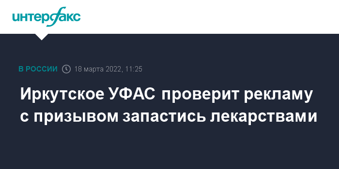 Москва. 18 марта. INTERFAX.RU - Управление ФАС по Иркутской области сообщило, что проверит рекламу с призывом сделать запас лекарств.