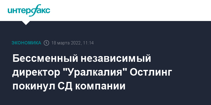 Москва. 18 марта. INTERFAX.RU - Пол Остлинг, бессменный член совета директоров "Уралкалия" с 2011 года, покинул его после введения санкций в отношении бенефициара компании Дмитрия Мазепина.