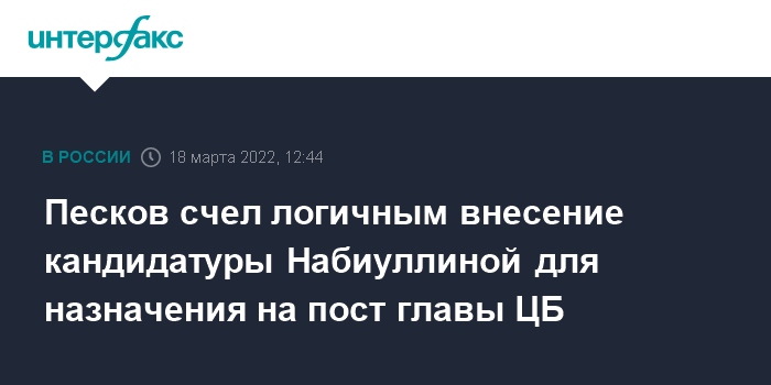 "Сейчас, когда на Центробанк ложится дополнительный груз ответственности за поддержание макроэкономической стабильности (...), разумеется, президент регулярно общается с Набиуллиной, президент неоднократно давал высокую оценку итогам работы Набиуллиной и Центробанка в целом. И мы видим, как логическое продолжение стало внесение ее кандидатуры еще на один срок", - сказал Песков в пятницу журналистам.