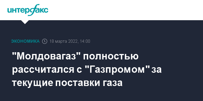 Москва. 18 марта. INTERFAX.RU - "Молдовагаз" полностью рассчитался с "Газпромом" за поставленный газ в феврале и первой половине марта, сообщил председатель правления компании Вадим Чебан.