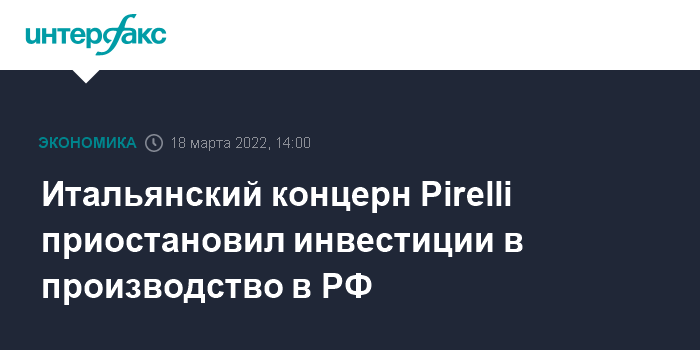 Pirelli отмечает, что инвестиции на российском рынке, за исключением вложений, связанных с безопасностью, были приостановлены. "Функционирование заводов в России будет постепенно ограничиваться операциями, которые необходимы для обеспечения заработной платы и социальных услуг для сотрудников", - говорится в пресс-релизе производителя шин.