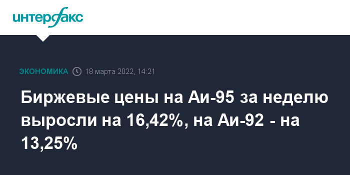 Биржевые цены на Аи-95 за неделю выросли на 16,42%, на Аи-92 - на 13,25%