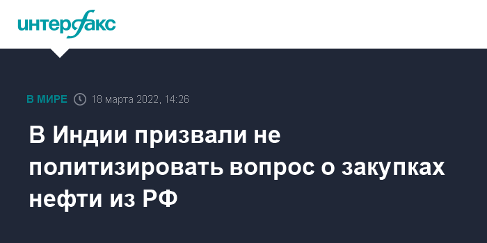 Москва. 18 марта. INTERFAX.RU - Власти Индии призвали не политизировать вопрос о том, у кого страна закупает нефть, сообщает в пятницу агентство EFE.