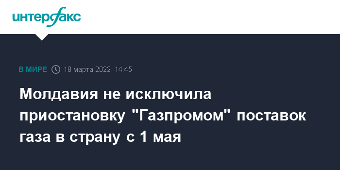 Москва. 18 марта. INTERFAX.RU - Правительство Молдавии допускает, что "Газпром" с 1 мая может приостановить поставки газа в страну, сообщил вице-премьер Андрей Спыну в эфире местного телеканала TV8.
