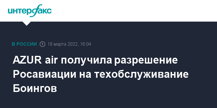 Москва. 18 марта. INTERFAX.RU - Авиакомпания AZUR air получила разрешение Росавиации на периодическое техобслуживание самолетов Boeing 737 и Boeing 777, зарегистрированных в российском реестре, сообщил представитель компании.