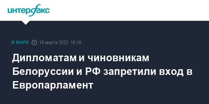 Москва. 18 марта. INTERFAX.RU -Российские и белорусские дипломаты и госслужащие больше не смогут входить в здания Европарламента, заявила президент Европарламента Роберта Метсола.
