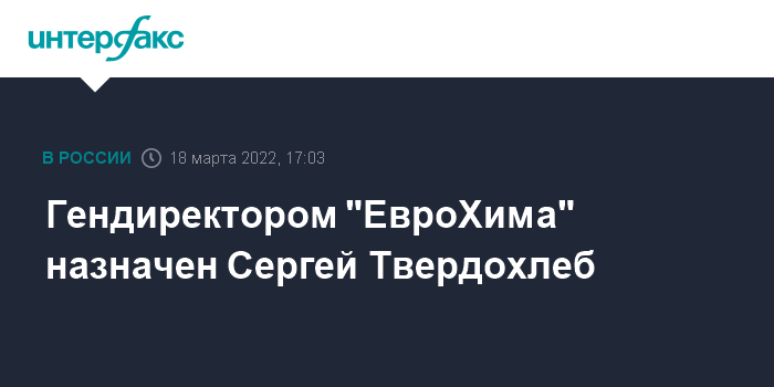 Москва. 18 марта. INTERFAX.RU - Гендиректором МХК "ЕвроХим" назначен Сергей Твердохлеб, ранее занимавший должность заместителя гендиректора по специальным проектам и внешним связям, сообщила компания.