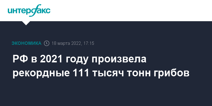 Москва. 18 марта. INTERFAX.RU - Тепличная отрасль РФ в 2021 году произвела рекордные 111 тысяч тонн грибов, что на 29% больше, чем в 2020 году, сообщает Минсельхоз.