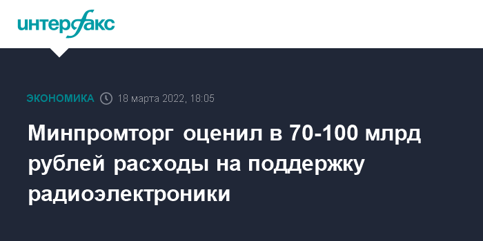 Москва. 18 марта. INTERFAX.RU - Для поддержки производства отечественной радиоэлектроники Минпромторг предложил направить через Фонд развития промышленности 70-100 млрд рублей на закупку комплектующих, электронно-компонентной базы, сырья и материалов. Эту оценку в эфире телеканала РБК назвал замминистра промышленности Василий Шпак.