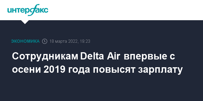 Москва. 18 марта. INTERFAX.RU - Американская авиакомпания Delta Air Lines намерена на 4% повысить зарплату большинству своих сотрудников впервые с осени 2019 года, следует из внутреннего документа компании, попавшего к журналистам.