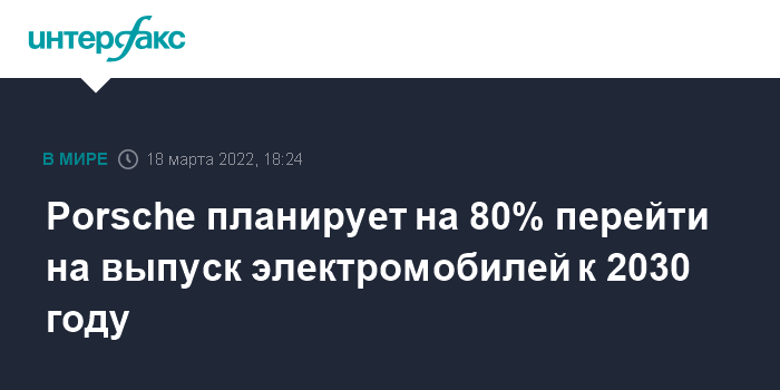Москва. 18 марта. INTERFAX.RU - Бренд автомобилей класса "люкс" Porsche AG, принадлежащий германской Volkswagen Group, планирует к 2030 году довести выпуск автомобилей на электродвигателях до 80% от общего объема производства, говорится в сообщении компании.