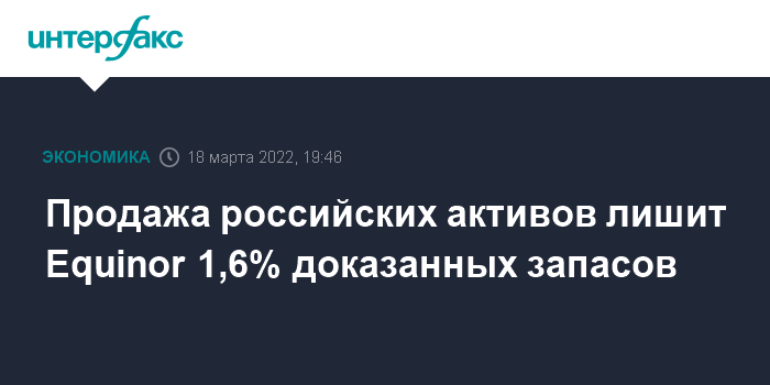 Москва. 18 марта. INTERFAX.RU - Норвежская Equinor, которая 28 февраля объявила о прекращении новых инвестиций в Россию и выходе из совместных предприятий в стране, сообщила 18 марта, что лишится из-за этого 88 млн баррелей нефтяного эквивалента запасов и 21,6 тыс. б.н.э. в сутки добычи.